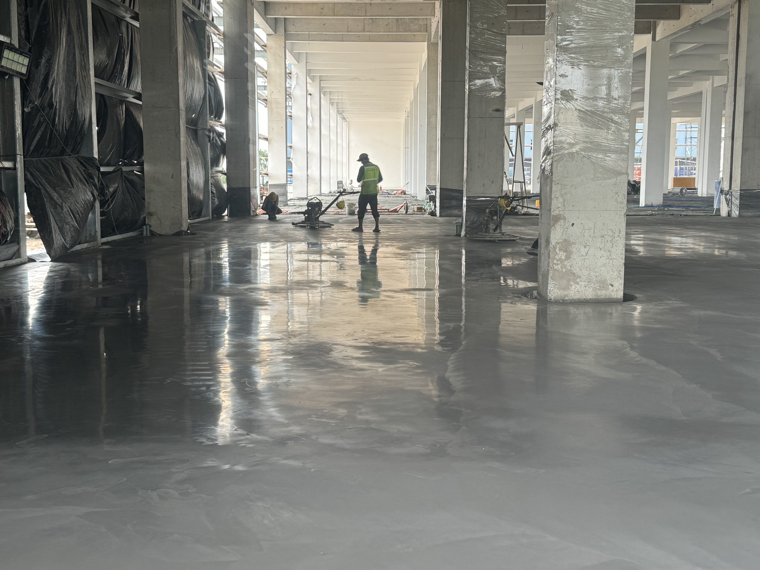 Dùng công nghệ sàn siêu phẳng, kết hợp xoa nền kèm Hardener kim loại: