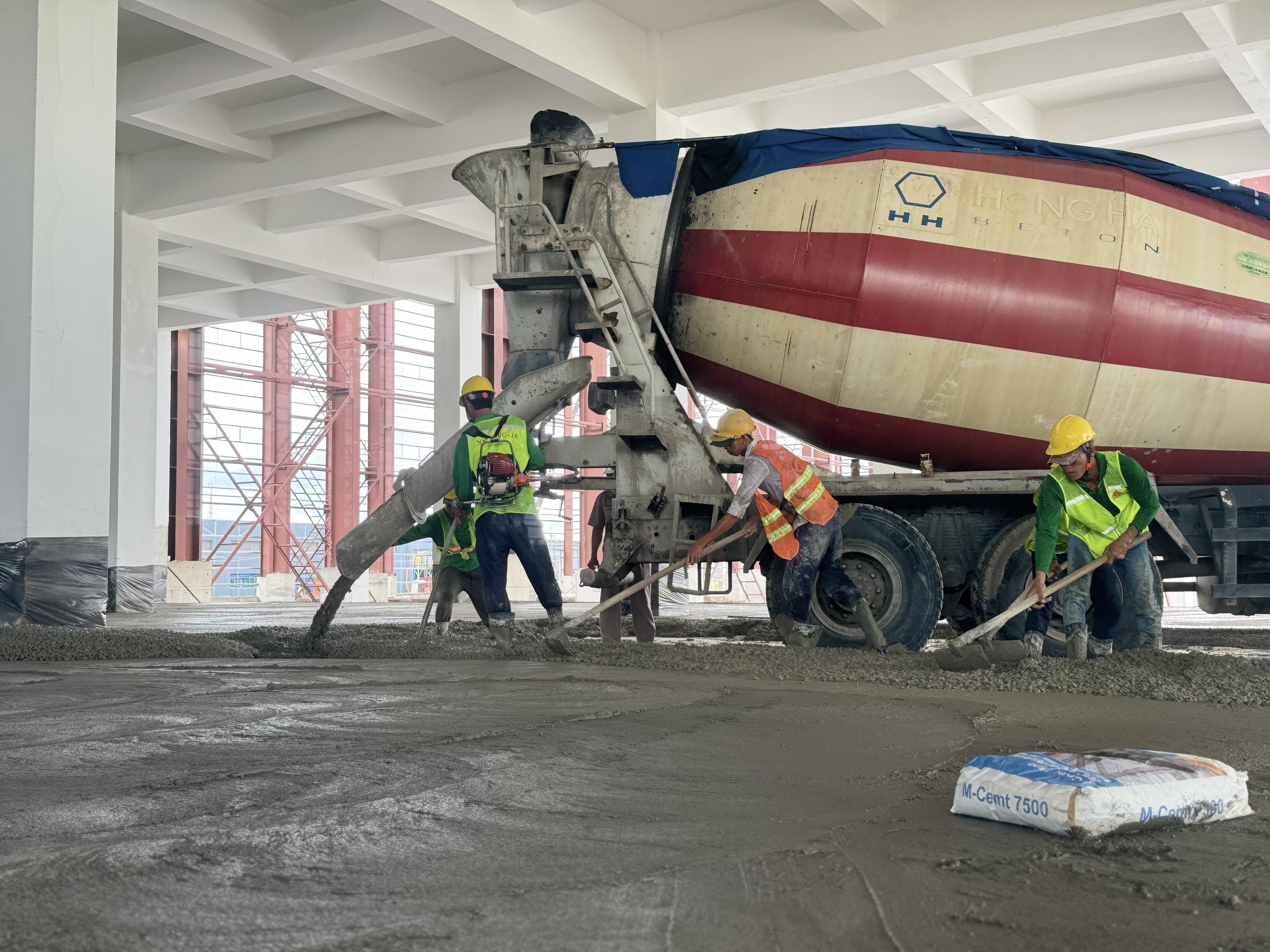 Trộn Bê Tông và Sợi Thép: Bê tông được trộn với sợi thép theo tỷ lệ chính xác để tăng cường độ bền và khả năng chống nứt. Sợi thép giúp cải thiện độ bền kéo, độ chịu uốn và khả năng chống nứt của bê tông, mang lại sự linh hoạt và độ bền cho sàn.